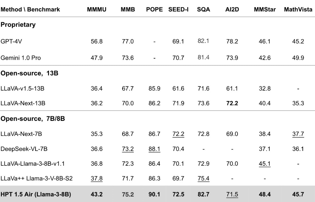 HPT Pro outperforms GPT-4V and Gemini Pro on the MMBench and SEED-Image benchmarks. On its part, HPT 1.5 Air is arguably the best multimodal Llama 3 in the market today, outperforming bigger, proprietary models on multiple benchmarks including MMMU and POPE.